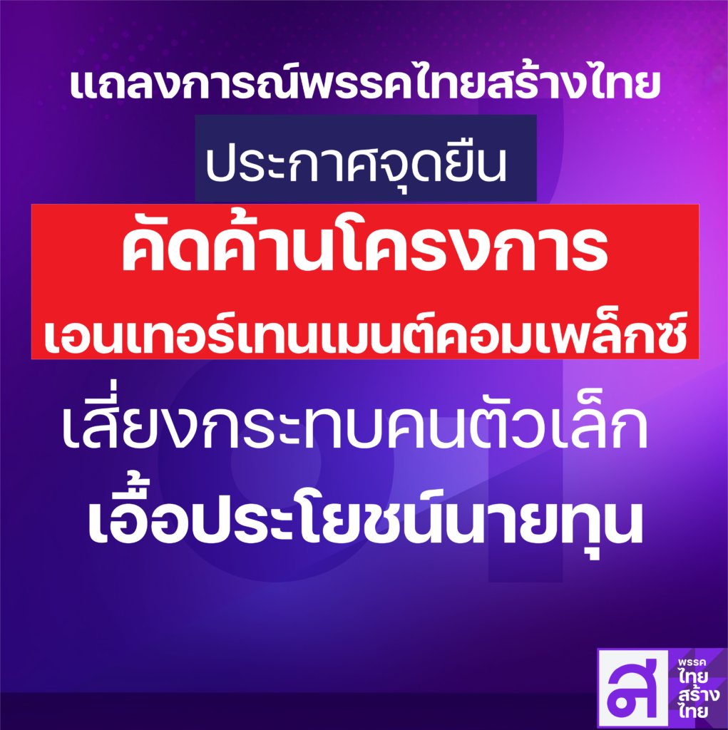 ตามที่รัฐบาลมีนโยบายโครงการเอนเทอร์เทนเมนต์คอมเพล็กซ์ ทั้งในกรุงเทพฯและจังหวัดตามภาคต่างๆ โดยได้รับความเห็นชอบจากคณะรัฐมนตรีเมื่อวันที่ 13 มกราคม 2568 จากนั้นจะเสนอร่างพ.ร.บ.การประกอบธุรกิจสถานบันเทิงครบวงจร พ.ศ. … ต่อสภาผู้แทนราษฎร ในโอกาสอันใกล้นั้น พรรคไทยสร้างไทยไม่เห็นด้วย ด้วยเหตุผลดังต่อไปนี้