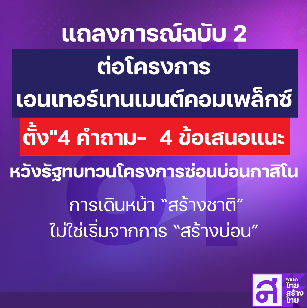 แถลงการณ์พรรคไทยสร้างไทย ฉบับที่ 2 เรื่องเอ็นเทอร์เทนเมนต์คอมเพล็กซ์ และการอนุญาตพนันออนไลน์ถูกกฎหมาย