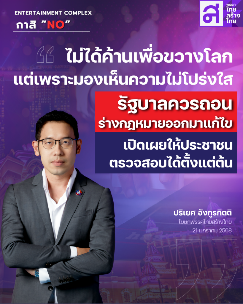 นายปริเยศ อังกูรกิตติ โฆษกพรรคไทยสร้างไทย เรียกร้องให้รัฐบาลถอนร่างกฎหมาย Entertainment Complex ซึ่งอยู่ระหว่างการส่งกฤษฎีกาเพื่อแก้ไขร่าง โดยให้เหตุผลว่าตัวบทกฎหมายในร่างแรกยังมีปัญหา และส่อไปในทางเอื้อประโยชน์ให้กับกลุ่มทุน รวมถึงไม่สามารถควบคุมผลกระทบที่เกิดจากคาสิโนได้ แม้กระทั่ง อดีตนายกรัฐมนตรีทักษิณ ชินวัตร ที่รัฐบาลให้ความเกรงใจ ยังออกมายอมรับว่าตัวร่างกฎหมายมีปัญหาหลายเรื่อง และมีจุดอ่อนหลายอย่าง