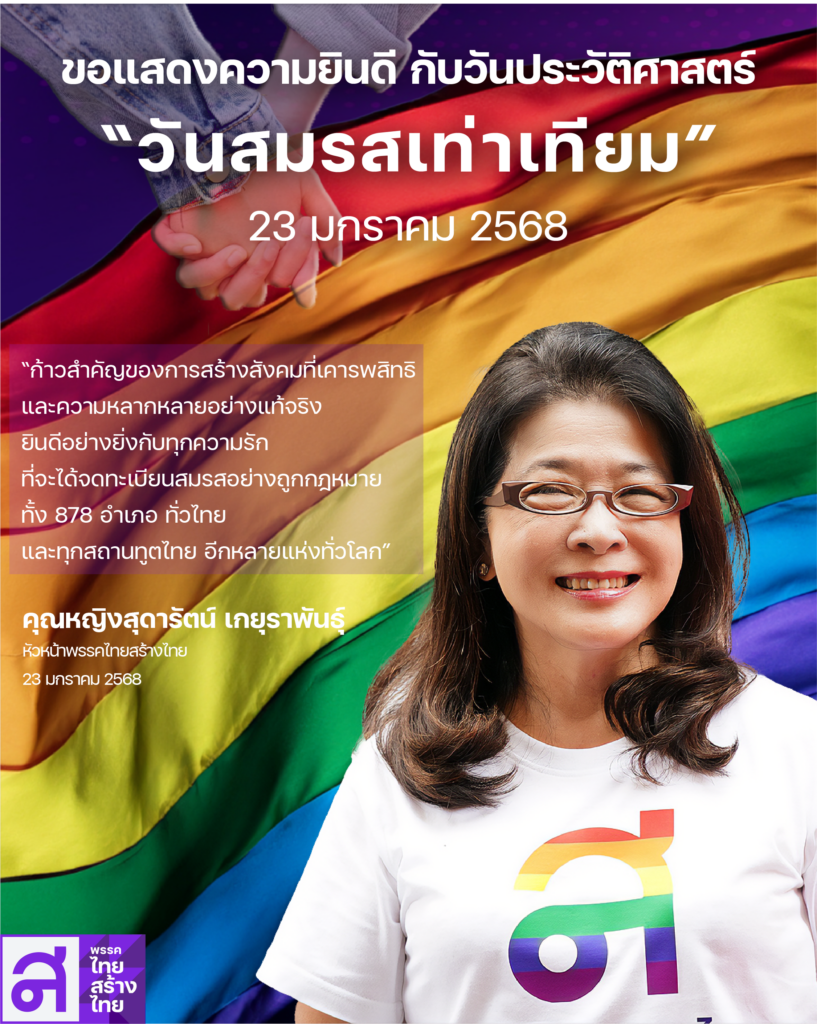 คุณหญิงสุดารัตน์ เกยุราพันธุ์ หัวหน้าพรรคไทยสร้างไทย แสดงความยินดีอย่างยิ่งกับการจดทะเบียนสมรส ตามกฎหมายสมรสเท่าเทียมได้มีผลใช้บังคับพร้อมกันทั่วประเทศในวันที่ 23 มกราคมนี้ โดยถือเป็นก้าวสำคัญที่สะท้อนถึงหลักการความเสมอภาคและเท่าเทียม ซึ่งเป็นสิทธิพื้นฐานที่ทุกคนควรได้รับการเคารพ
