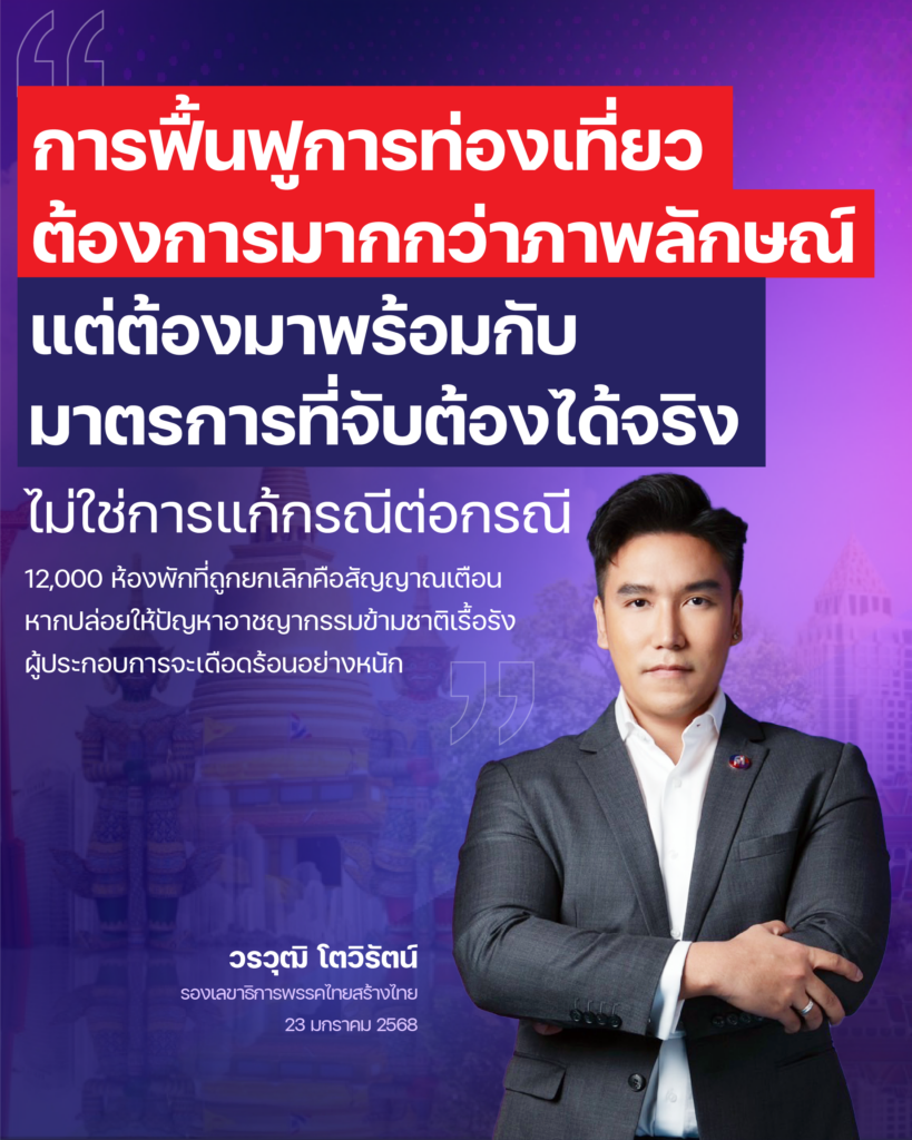 “ไทยสร้างไทย” เรียกร้องรัฐบาล เร่งช่วยผู้ประกอบการท่องเที่ยว หลังห้องพักกว่า 12,000 ห้องถูกยกเลิก ระบุอัดคลิปผ่าน AI อย่างเดียวไม่พอ แต่ต้องเร่งคลอดมาตรกระตุ้นการท่องเที่ยวภายใน และมาตรการช่วยเหลือเชิงรุกแก่ผู้ประกอบการที่ได้รับผลกระทบ