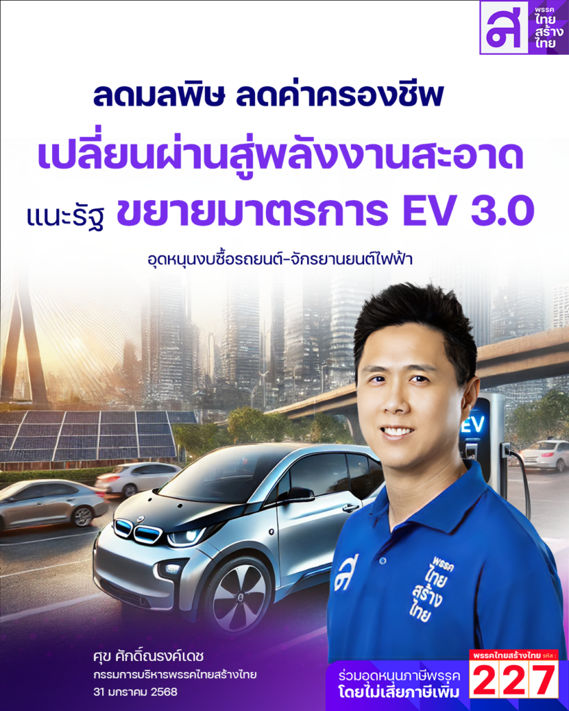 นายศุข ศักดิ์ณรงค์เดช กรรมการบริหารพรรคไทยสร้างไทย เรียกร้องให้รัฐบาลเร่งออกนโยบายสนับสนุนให้ประชาชนผู้มีรายได้น้อยสามารถเข้าถึงรถจักรยานยนต์ไฟฟ้าได้ง่ายขึ้น โดยเฉพาะผู้ที่ครอบครองรถจักรยานยนต์เครื่องยนต์สันดาปอายุเกิน 10 ปี ซึ่งถือเป็นกลุ่มเป้าหมายหลักของการเปลี่ยนผ่านไปสู่ยานยนต์ที่สะอาดและเป็นมิตรต่อสิ่งแวดล้อม