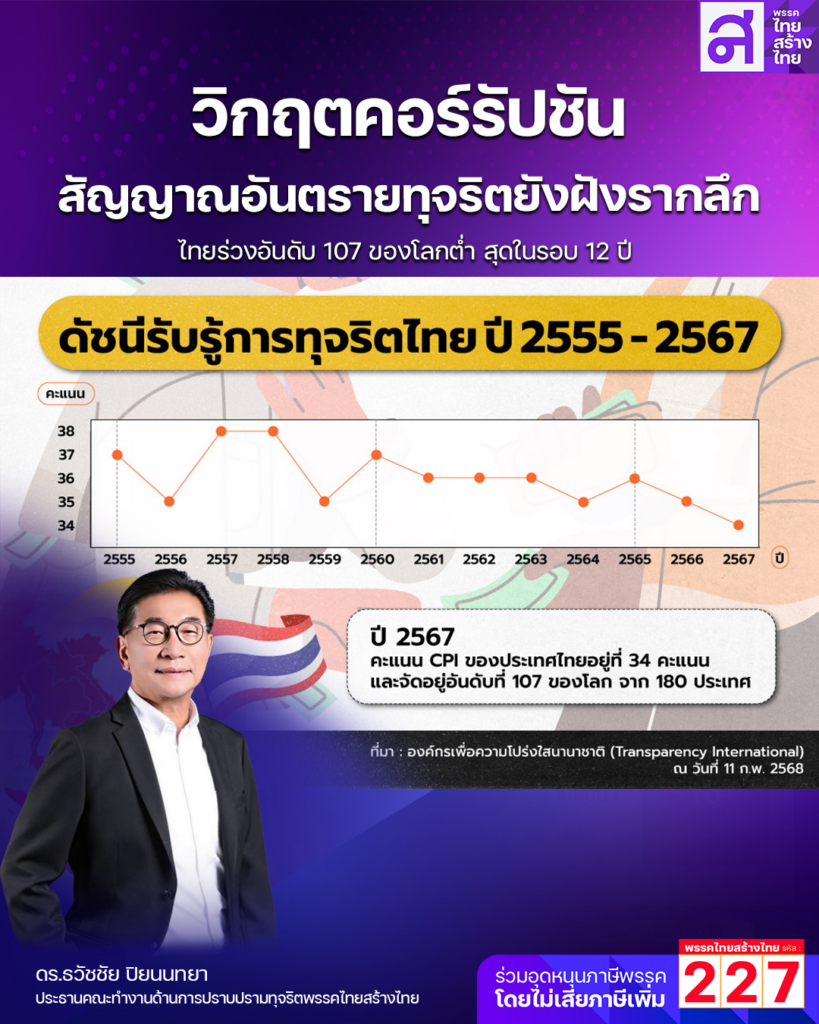 พรรคไทยสร้างไทย มีความกังวลอย่างยิ่งต่อสถานการณ์นี้ เพราะดัชนีดังกล่าวสะท้อนว่าประเทศไทยยังคงเผชิญกับปัญหาคอร์รัปชันที่รุนแรง ไม่ว่าจะเป็นความไม่โปร่งใสในการใช้งบประมาณ นโยบายที่เอื้อประโยชน์ต่อกลุ่มทุน และการขาดประสิทธิภาพในการปราบปรามการทุจริต