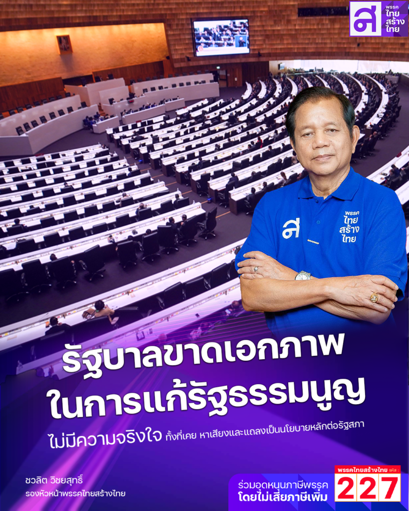 นายชวลิต วิชยสุทธิ์ รองหัวหน้าพรรคไทยสร้างไทย ชี้เหตุที่รัฐสภาล่มในการพิจารณาญัตติแก้รัฐธรรมนูญ เพราะรัฐบาลขาดเอกภาพในการเสนอแก้ไขรัฐธรรมนูญให้เป็นประชาธิปไตย ทั้งๆ ที่หาเสียงกับประชาชนอย่างมั่นใจ และเป็นนโยบายหลักของรัฐบาลที่แถลงต่อรัฐสภาด้วย แต่กลับไม่มีร่างจากคณะรัฐมนตรีในการพิจารณาแต่อย่างใด