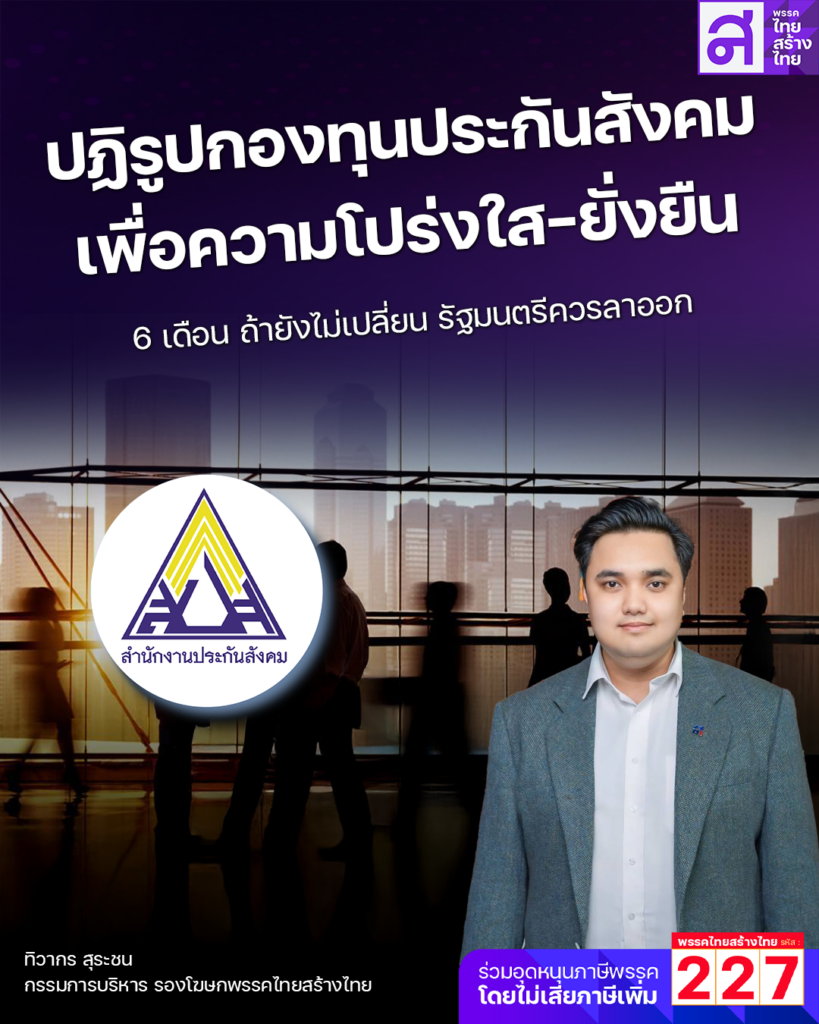 นายทิวากร สุระชน กรรมการบริหารและรองโฆษกพรรคไทยสร้างไทย เห็นว่าปัญหาความไม่โปร่งใสและการบริหารงานที่ขาดประสิทธิภาพของกองทุนประกันสังคม โดยเฉพาะด้านการใช้จ่ายงบประมาณที่ไม่เหมาะสม การลงทุนที่ให้ผลตอบแทนต่ำ และการบริหารที่ขาดการมีส่วนร่วมจากผู้ประกันตนนั้น ถึงเวลาแล้วที่ต้องปฏิรูปสำนักงานประกันสังคม เพื่อให้เกิดความโปร่งใส ยั่งยืน และสามารถรองรับความต้องการของแรงงานไทยในระยะยาว
