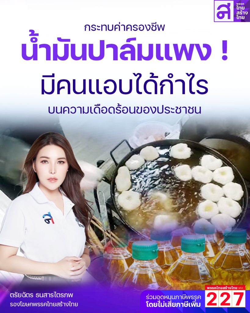 นางสาวตรัยฉัตร ธนสารไตรภพ รองโฆษกพรรคไทยสร้างไทย เปิดเผยถึงสถานการณ์ราคาน้ำมันปาล์มขวดที่ปรับตัวสูงขึ้น ส่งผลกระทบต่อประชาชนและผู้ประกอบการขนาดกลางและขนาดย่อม (SME) เป็นวงกว้าง โดยระบุว่า ปัจจุบันราคาน้ำมันปาล์มในตลาดพุ่งสูงขึ้นอย่างต่อเนื่อง เนื่องจากปัจจัยหลัก 2 ประการ ได้แก่ ปริมาณผลผลิตปาล์มน้ำมันลดลงจากสภาพอากาศที่แปรปรวน และความต้องการน้ำมันปาล์มในตลาดโลกที่เพิ่มขึ้น