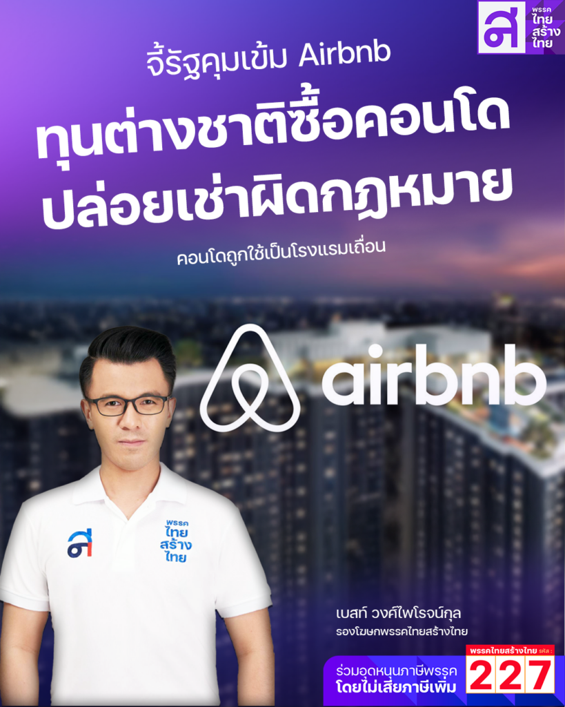 เบสท์ วงศ์ไพโรจน์กุล รองโฆษกพรรคไทยสร้างไทย กล่าวถึงการปล่อยเช่าคอนโดมิเนียมรายวันผ่านแพลตฟอร์มออนไลน์ เช่น Airbnb กำลังสร้างปัญหาด้านความปลอดภัยและกระทบต่อทรัพยากรส่วนกลางของผู้อยู่อาศัยในหลายพื้นที่ท่องเที่ยวสำคัญของประเทศไทย โดยเฉพาะในกรุงเทพฯ พัทยา ภูเก็ต และเชียงใหม่ ซึ่งปัญหาดังกล่าวยังคงเกิดขึ้นแม้จะมีกฎหมายหลายฉบับที่ควบคุมเรื่องนี้
