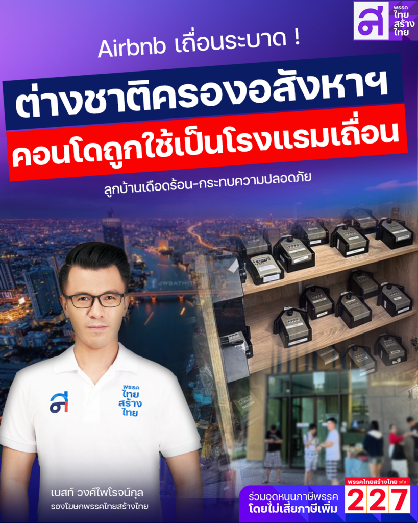 “ไทยสร้างไทย” จี้รัฐบาลเร่งจัดการ Airbnb เถื่อนหวั่นทุนจีนยึดคอนโด พร้อมปล่อยเช่าผิดกฎหมาย กระทบความปลอดภัยลูกบ้าน แฉช่องโหว่กฎหมาย-ความล่าช้า อาจทำลายเศรษฐกิจชาติ และความมั่นคงของประเทศในระยะยาว