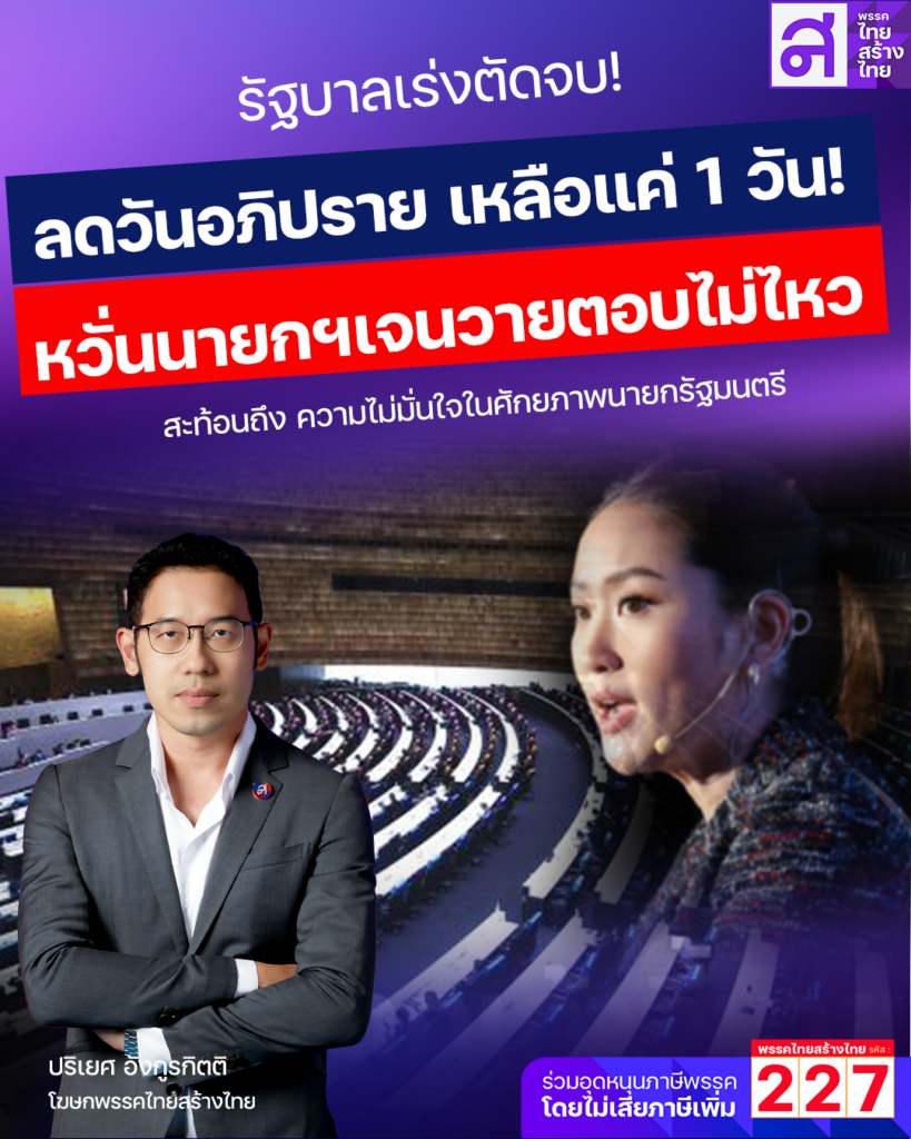 นายปริเยศ อังกูรกิตติ โฆษกพรรคไทยสร้างไทย แสดงความคิดเห็นเกี่ยวกับกระแสข่าวที่คณะกรรมการประสานงานพรรคร่วมรัฐบาล (วิปรัฐบาล) อาจให้เวลาการอภิปรายไม่ไว้วางใจเพียง 1 วัน หลังฝ่ายค้านตัดสินใจอภิปรายแบบเฉพาะเจาะจงไปที่ตัวนายกรัฐมนตรี นางสาวแพทองธาร ชินวัตร