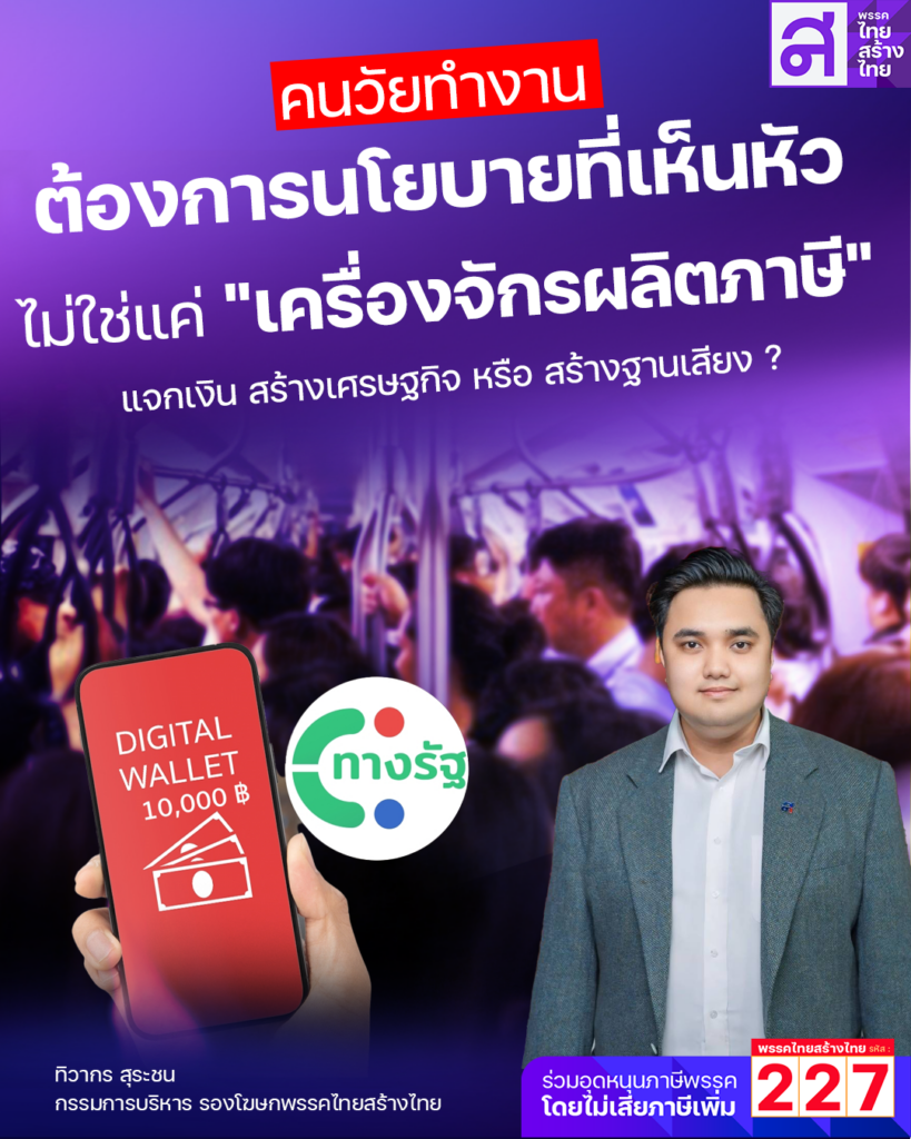 “คนวัยทำงานคือกระดูกสันหลังของประเทศ พวกเขาเสียภาษีบุคคลเพื่อนำไปใช้พัฒนาประเทศและสนับสนุนโครงการรัฐ แต่กลับถูกจัดให้อยู่ในลำดับท้ายสุดของการได้รับเงินดิจิทัลวอลเล็ต ทั้งที่พวกเขาคือกลุ่มที่กระตุ้นเศรษฐกิจได้มากที่สุด” นายทิวากรกล่าว