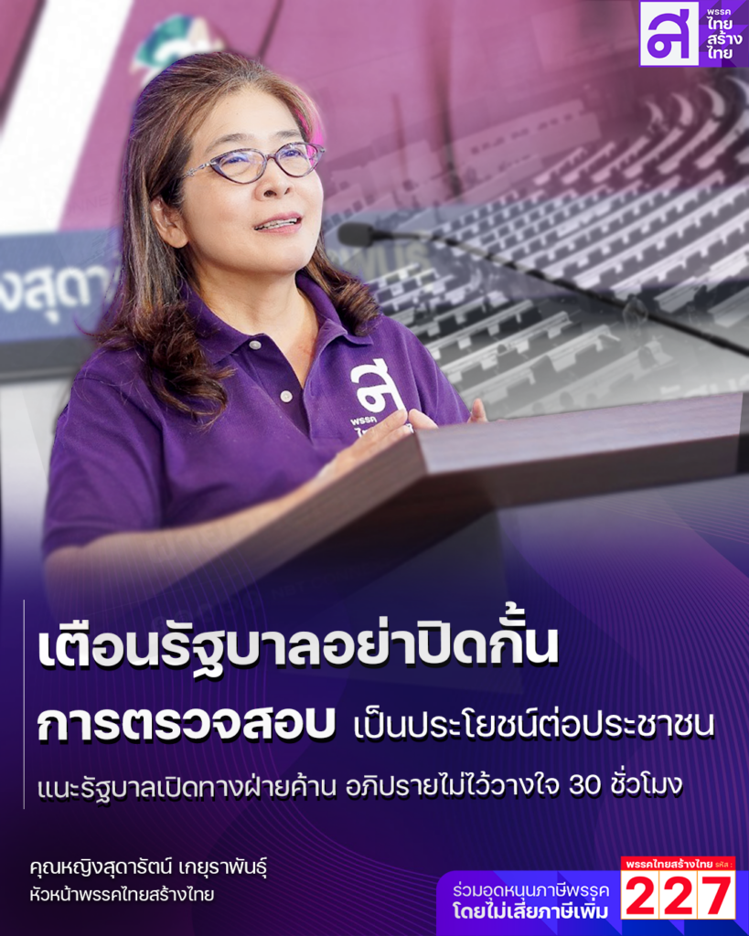 คุณหญิงสุดารัตน์ เกยุราพันธุ์ หัวหน้าพรรคไทยสร้างไทย เรียกร้องให้รัฐบาลเปิดโอกาสให้ฝ่ายค้านได้ทำหน้าที่ตรวจสอบอย่างเต็มที่ ในการอภิปรายไม่ไว้วางใจ น.ส.แพทองธาร ชินวัตร นายกรัฐมนตรี โดยเสนอให้มีระยะเวลาอภิปราย 30 ชั่วโมง เพื่อนำเสนอข้อมูลที่สำคัญและเป็นประโยชน์ต่อประชาชนได้อย่างครบถ้วน