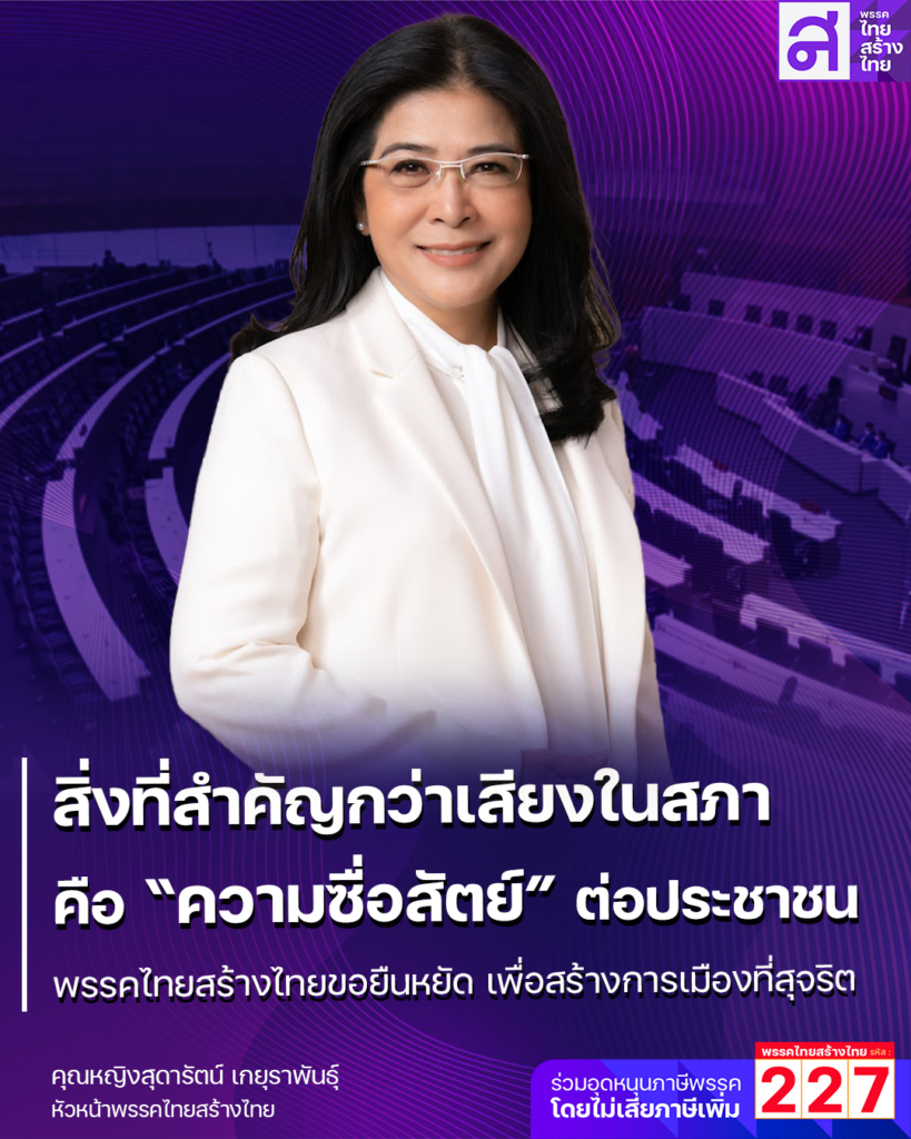 คุณหญิงสุดารัตน์ ย้ำว่า อุดมการณ์ ของพรรคไทยสร้างไทยคือการ“สร้างการเมืองสุจริต” ไม่ทรยศหักหลังประชาชน ถึงแม้ว่าเราจะเหลือสส.ที่มีอุดมการณ์ และไม่ตระบัดสัตย์เพียงคนเดียว เราก็จะทำเดินหน้ามุ่งมั่นทำ“การเมืองสุจริต” ต่อไป