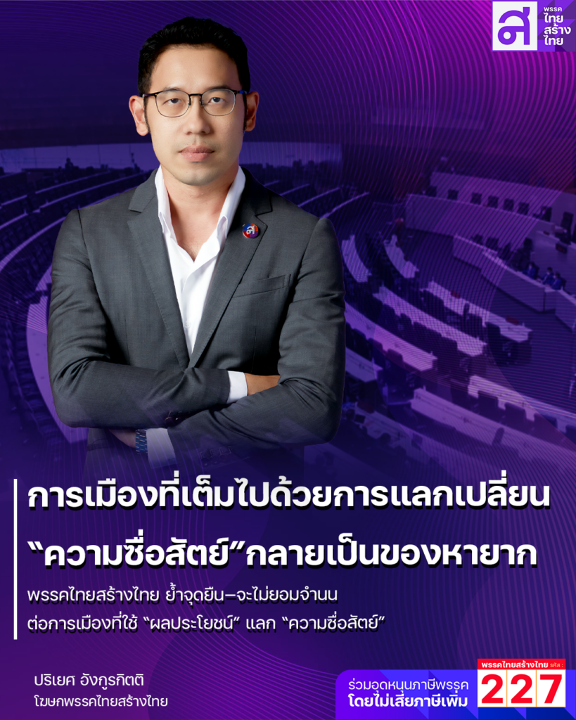 โฆษกพรรคไทยสร้างไทย ย้ำว่า พรรคไทยสร้างไทยขอยืนหยัดบนหลักการสร้างการเมืองสุจริตโปร่งใสและซื่อสัตย์ พรรคจะเดินหน้าสร้างวัฒนธรรมการเมืองที่ให้ความสำคัญกับประชาชนมากกว่าผลประโยชน์ส่วนตัว โดยเฉพาะการยึดมั่นในอุดมการณ์ประชาธิปไตย เราจึงขอเชิญชวนประชาชนที่เห็นด้วยกับแนวทางของเรา มาร่วมต่อสู้กับการเมืองทุจริตที่กำลังทำลายประเทศ โดยพรรคจะใช้โอกาสนี้ปรับโครงสร้าง เสริมทีมงานที่มุ่งมั่นจริง เพื่อเดินหน้านโยบายที่เป็นประโยชน์ต่อประชาชนอย่างแท้จริง