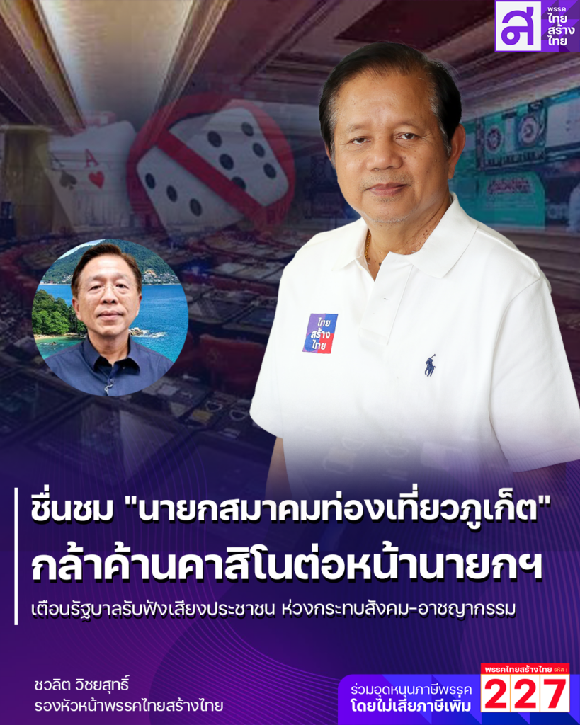 นายชวลิต วิชยสุทธิ์ รองหัวหน้าพรรคไทยสร้างไทย กล่าวชื่นชม นายธเนศ ตันติพิริยะกิจ นายกสมาคมธุรกิจการท่องเที่ยวจังหวัดภูเก็ต ที่แสดงจุดยืนคัดค้านการมี “กาสิโน” ในโครงการเอนเทอร์เทนเมนต์คอมเพล็กซ์ ระหว่างงาน Thailand Sustainable Tourism Conference 2025 ซึ่งจัดขึ้นที่จังหวัดภูเก็ต โดยมี น.ส.แพทองธาร ชินวัตร นายกรัฐมนตรี เป็นประธานเปิดงานและบรรยายพิเศษในหัวข้อ “การท่องเที่ยวที่ยั่งยืน”
