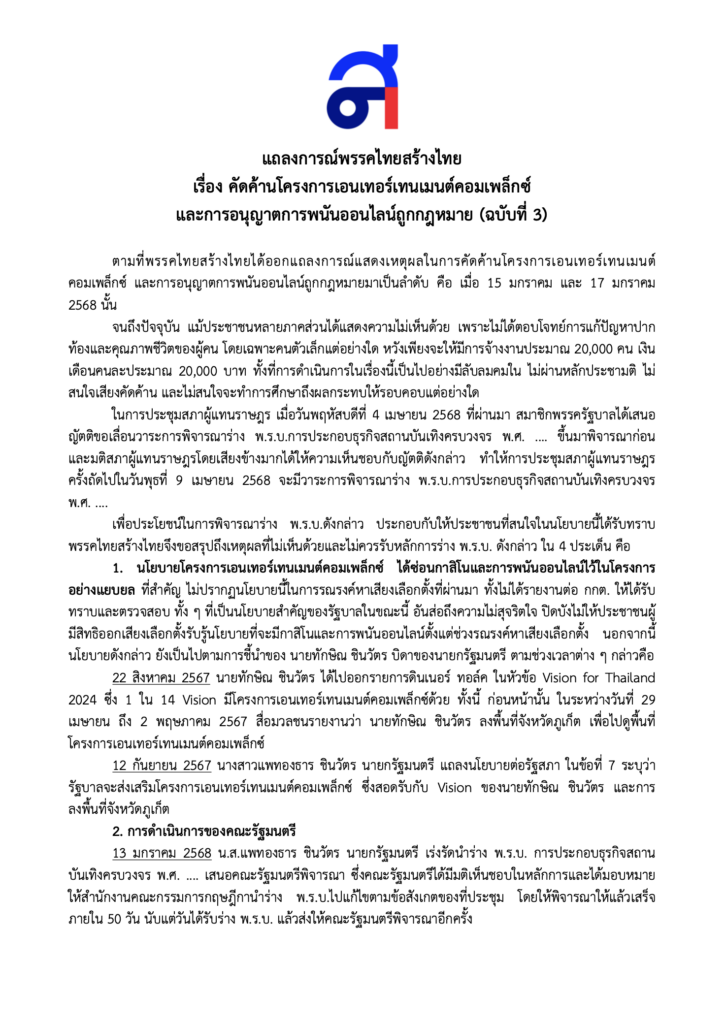 ตามที่พรรคไทยสร้างไทยได้ออกแถลงการณ์แสดงเหตุผลในการคัดค้านโครงการเอนเทอร์เทนเมนต์คอมเพล็กซ์ และการอนุญาตการพนันออนไลน์ถูกกฎหมายมาเป็นลำดับ คือ เมื่อ 15 มกราคม และ 17 มกราคม 2568 นั้น